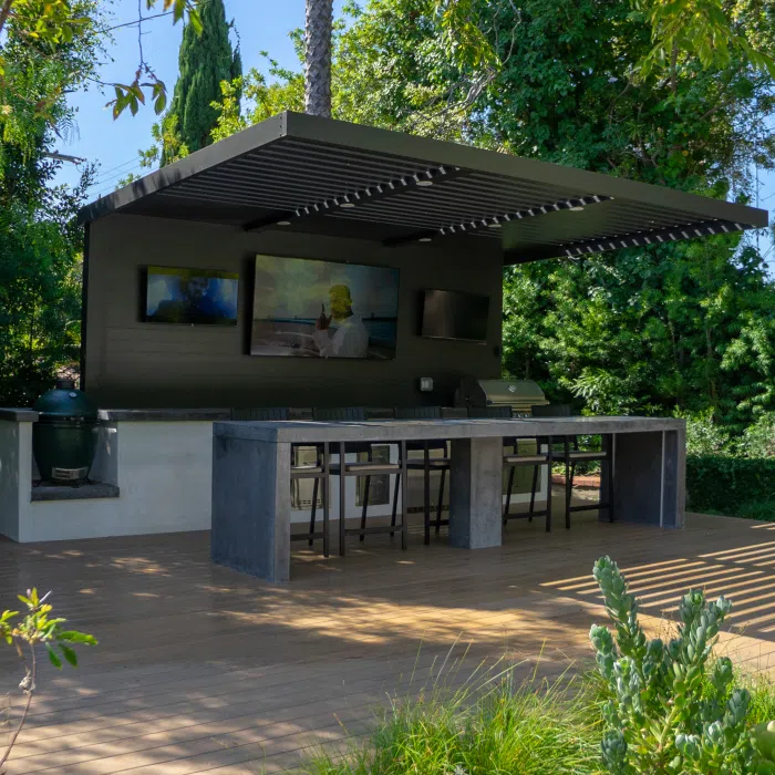 Durable and attractive pergola by MG Construction & Decks over a sophisticated outdoor grill and bar seating area